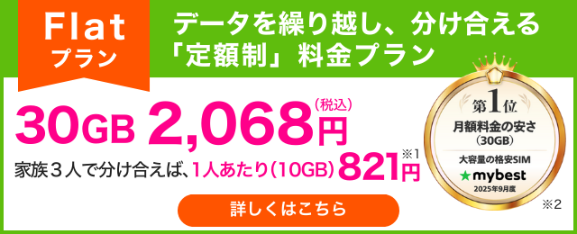 ・Flat(フラット)プラン:1,210円(税込)引き*音声通話料、追加SIM利用料、データチャージ利用料、モバイルオプション利用料は