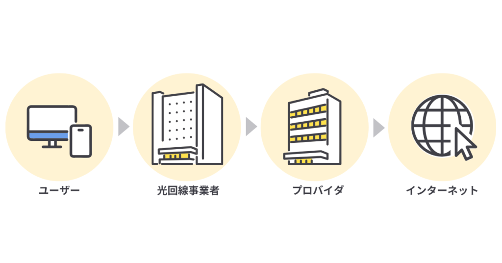 プロバイダー(ISP:Internet Service Provider)とは、インターネットに接続するためのサービスを提供する事業者のことです。光回線を通じてインターネットを利用する際には、必ずプロバイダーと契約する必要があります。