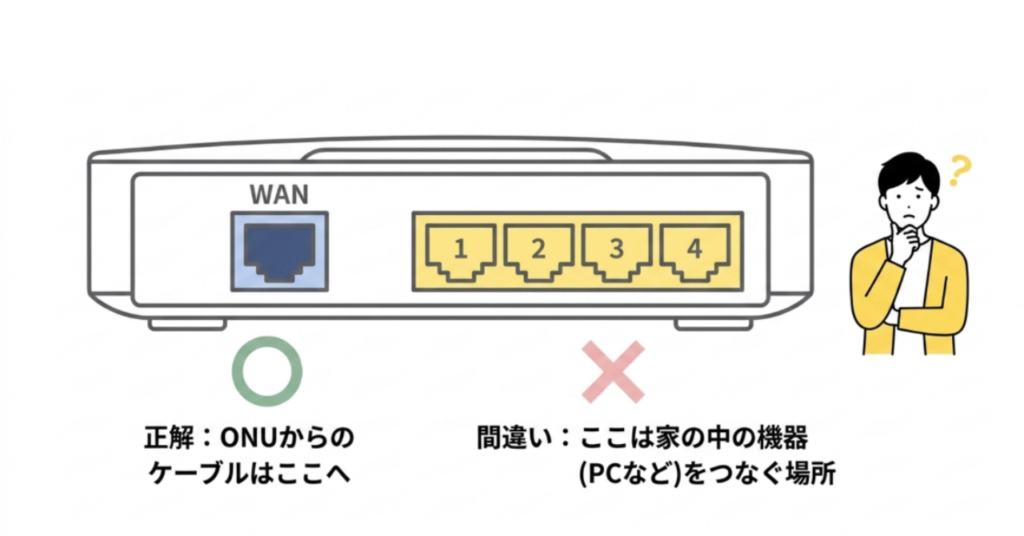間違えてLANポートにONUからのケーブルをつなぐと、インターネットに接続できません。設置の際は必ずポートの表記を確認しましょう。